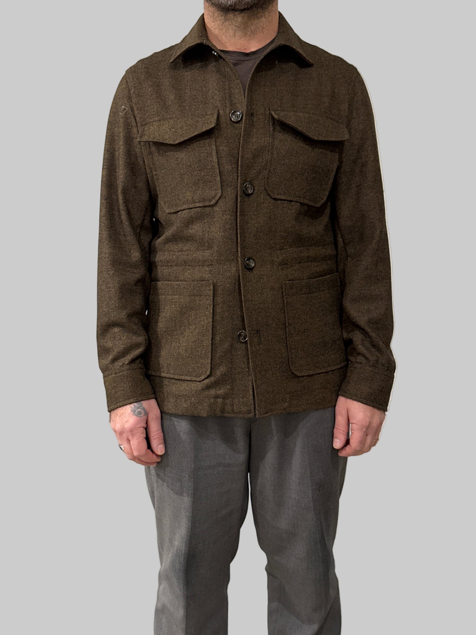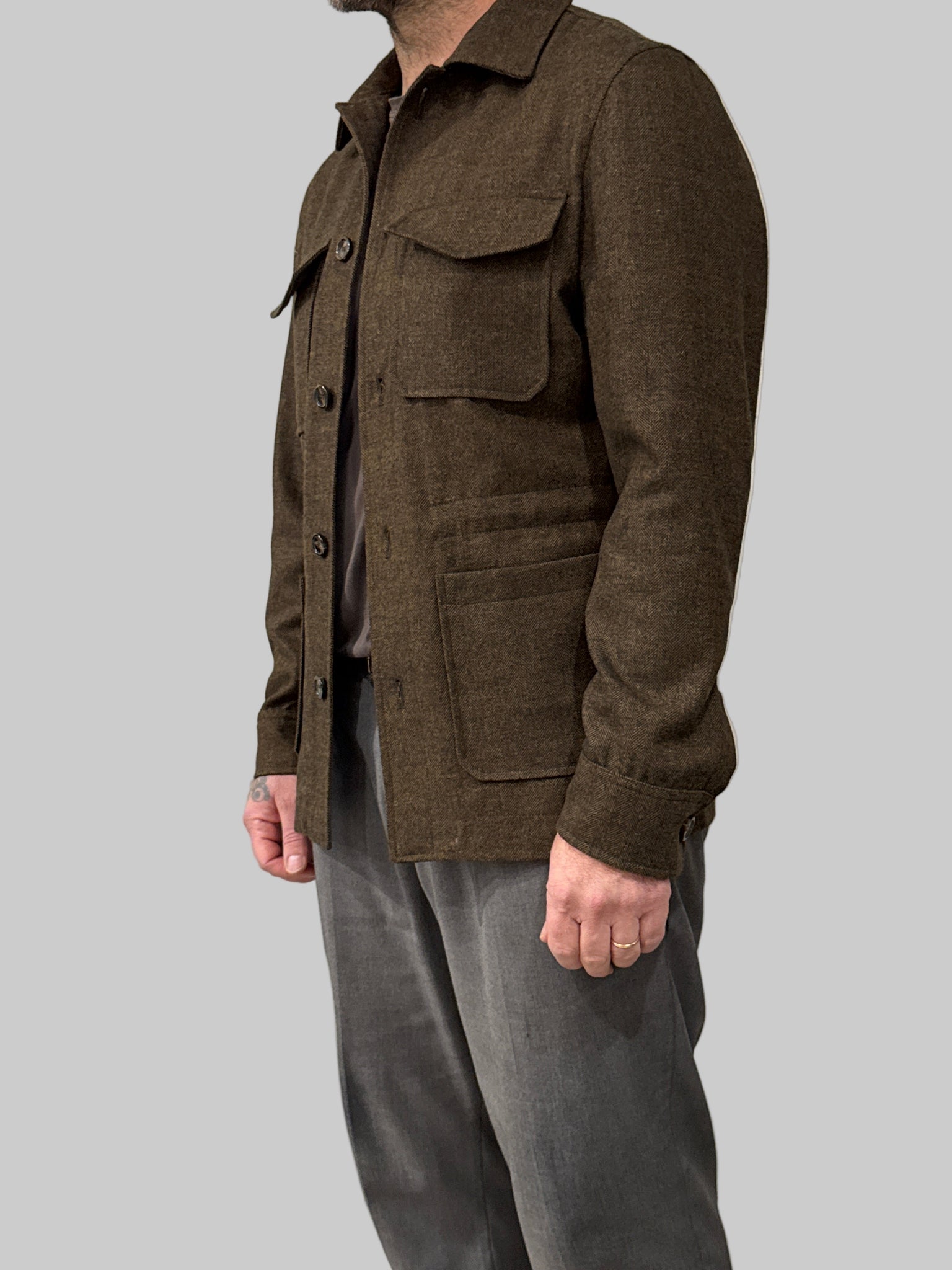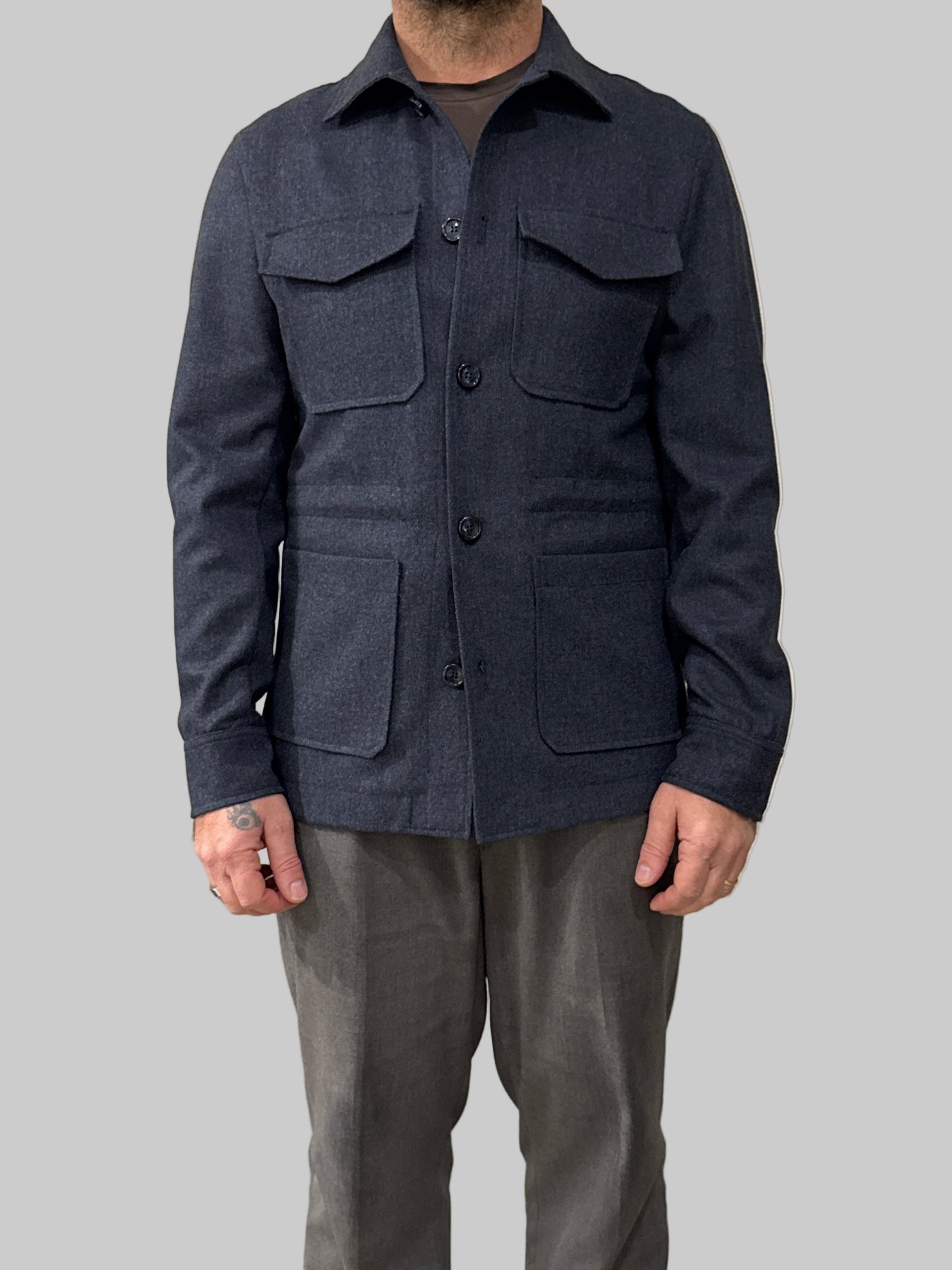 La SAHARIANA MARECHIARE incarna lo stile classico della tradizione sartoriale italiana. Realizzata in lana spigata di qualità, questa giacca sahariana presenta tasche funzionali sul petto e una vestibilità regolare che si adatta elegantemente a diverse morfologie. Il taglio strutturato e i dettagli ricercati la rendono versatile per occasioni casual e semi-formali. Prodotta interamente in Italia, garantisce artigianalità e attenzione ai materiali. Un capo essenziale per chi ricerca autenticità e raffinatezza nel guardaroba.