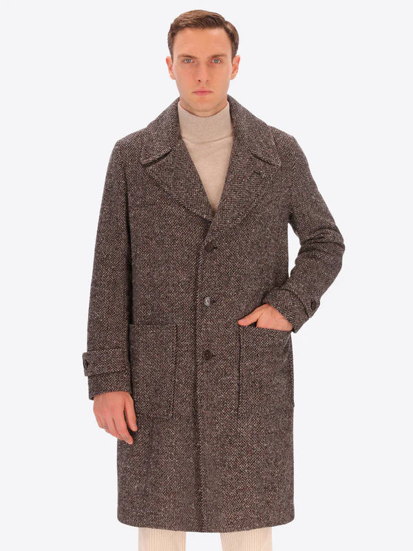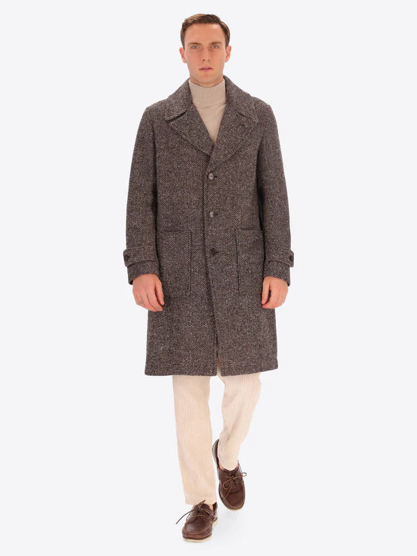 Cappotto over in panno resca misto lana bottonata. Il capo si presenta con un’apertura a 3 bottoni, due tasche a toppa con pattina e l’interno corpo sfoderato con bordi a contrasto e una tasca in punto Milano. Sempre internamente ci sono 2 bretelle elastiche staccabili con logo. Maniche foderate.