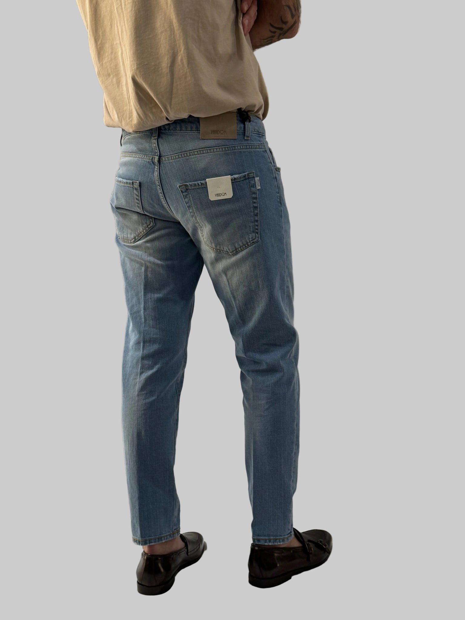 Jeans in denim elastico con cinque tasche e vestibilità regolare. Realizzato in Italia con attenzione ai dettagli e alla qualità costruttiva. Il tessuto elasticizzato garantisce comfort durante tutto il giorno, mantenendo una silhouette classica e versatile. Perfetto per un look casual raffinato che si adatta a molteplici occasioni.
