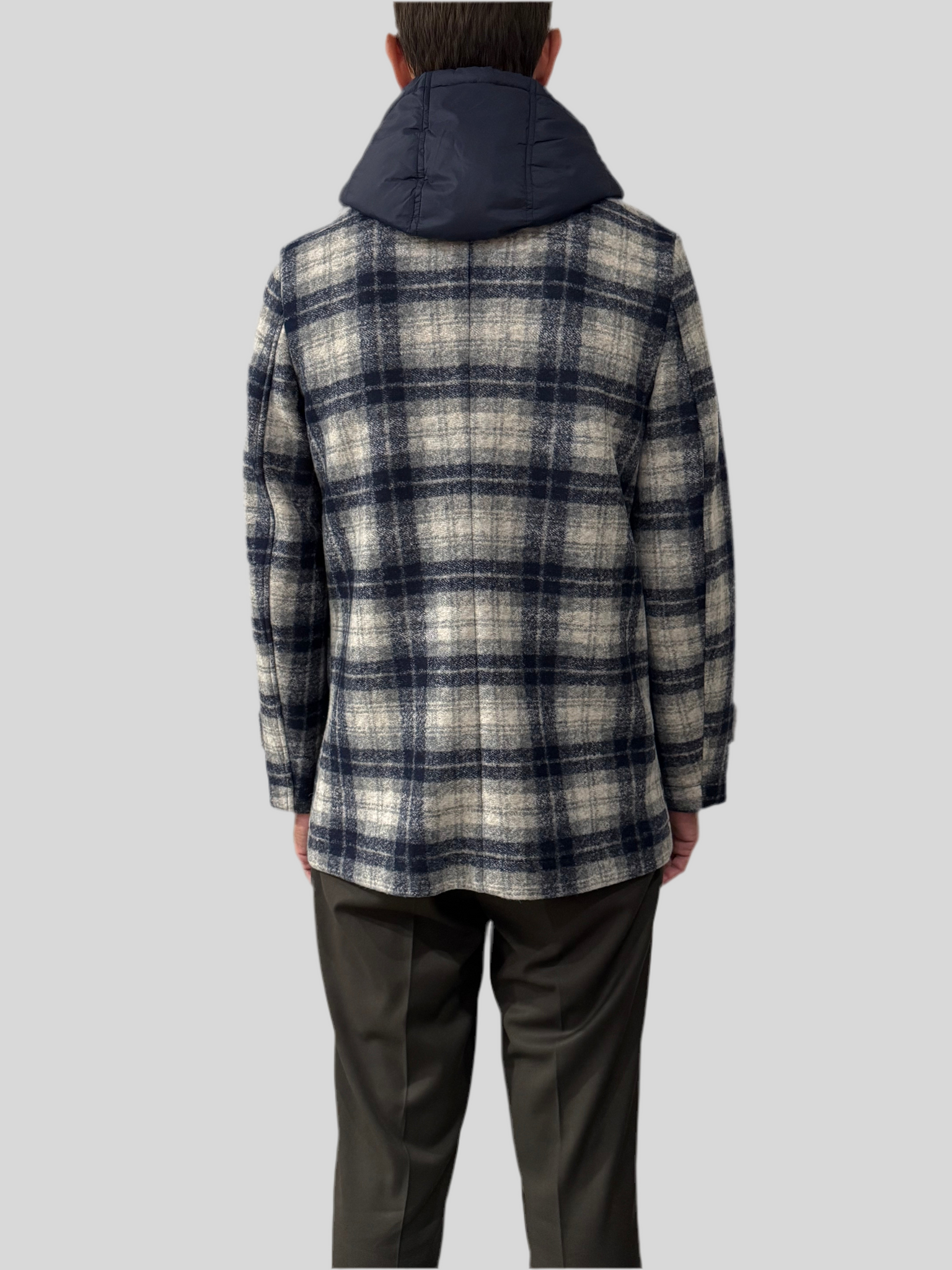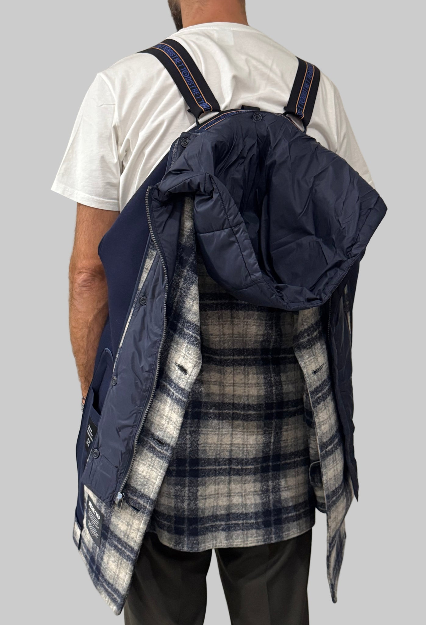 Peacoat in lana fantasia. Il capo si presenta con un’apertura a doppio petto con asole e bottoni, due tasche a filetto e l’interno corpo sfoderato con bordi a contrasto con una tasca in punto Milano. Sempre internamente ci sono 2 bretelle elastiche staccabili con logo. Inoltre il capo presenta una pettorina con cappuccio in nylon imbottito staccabile.