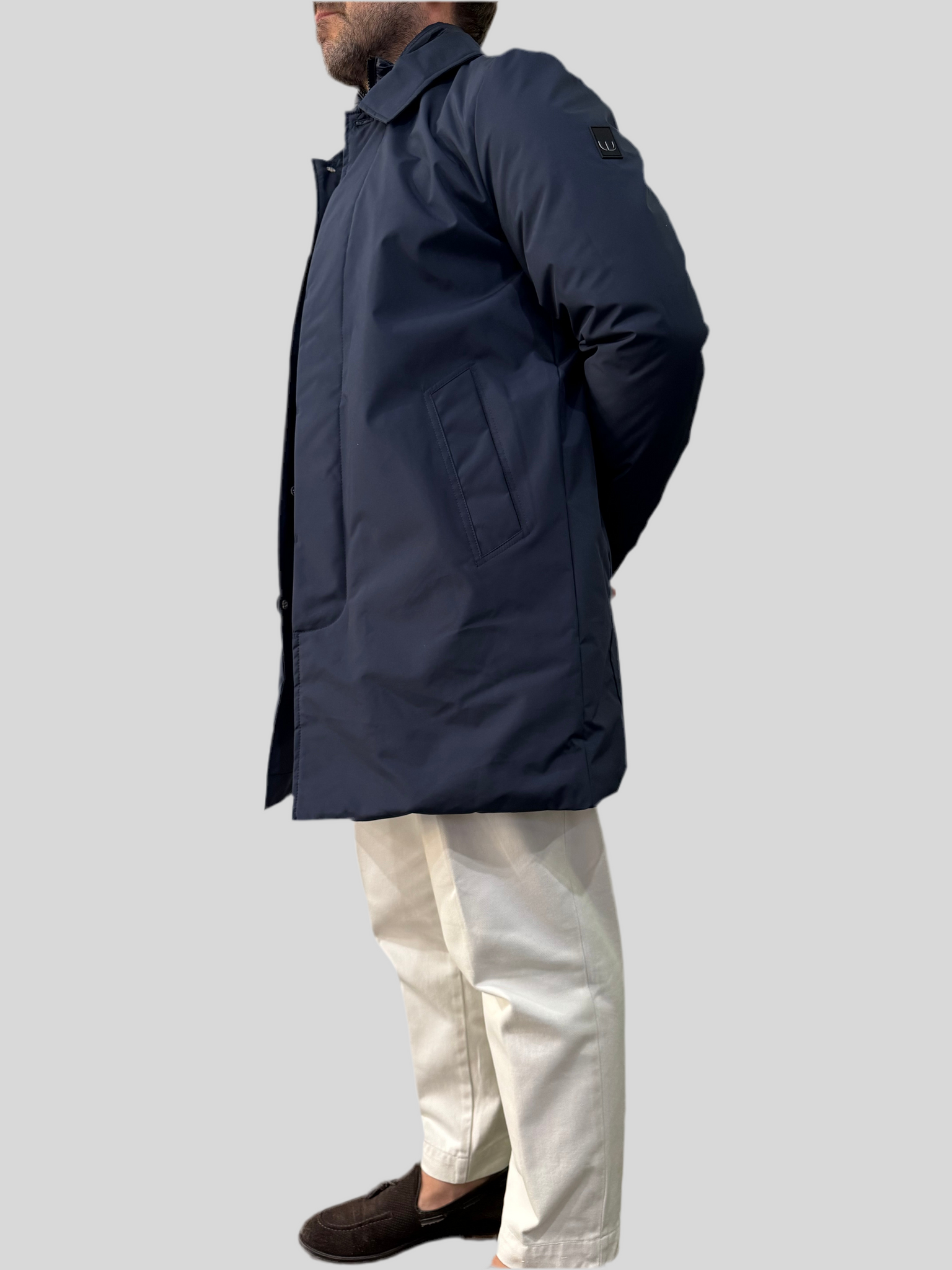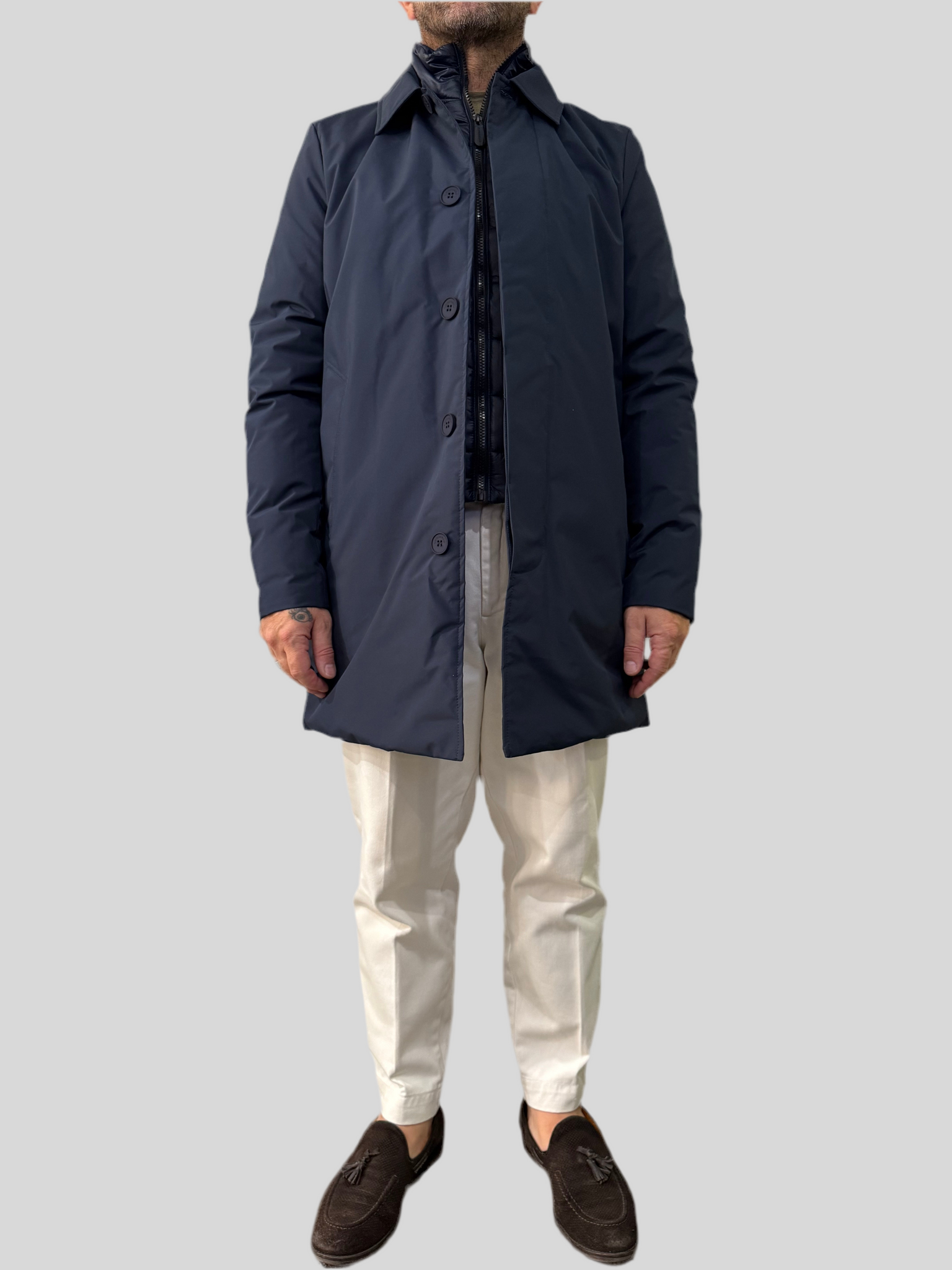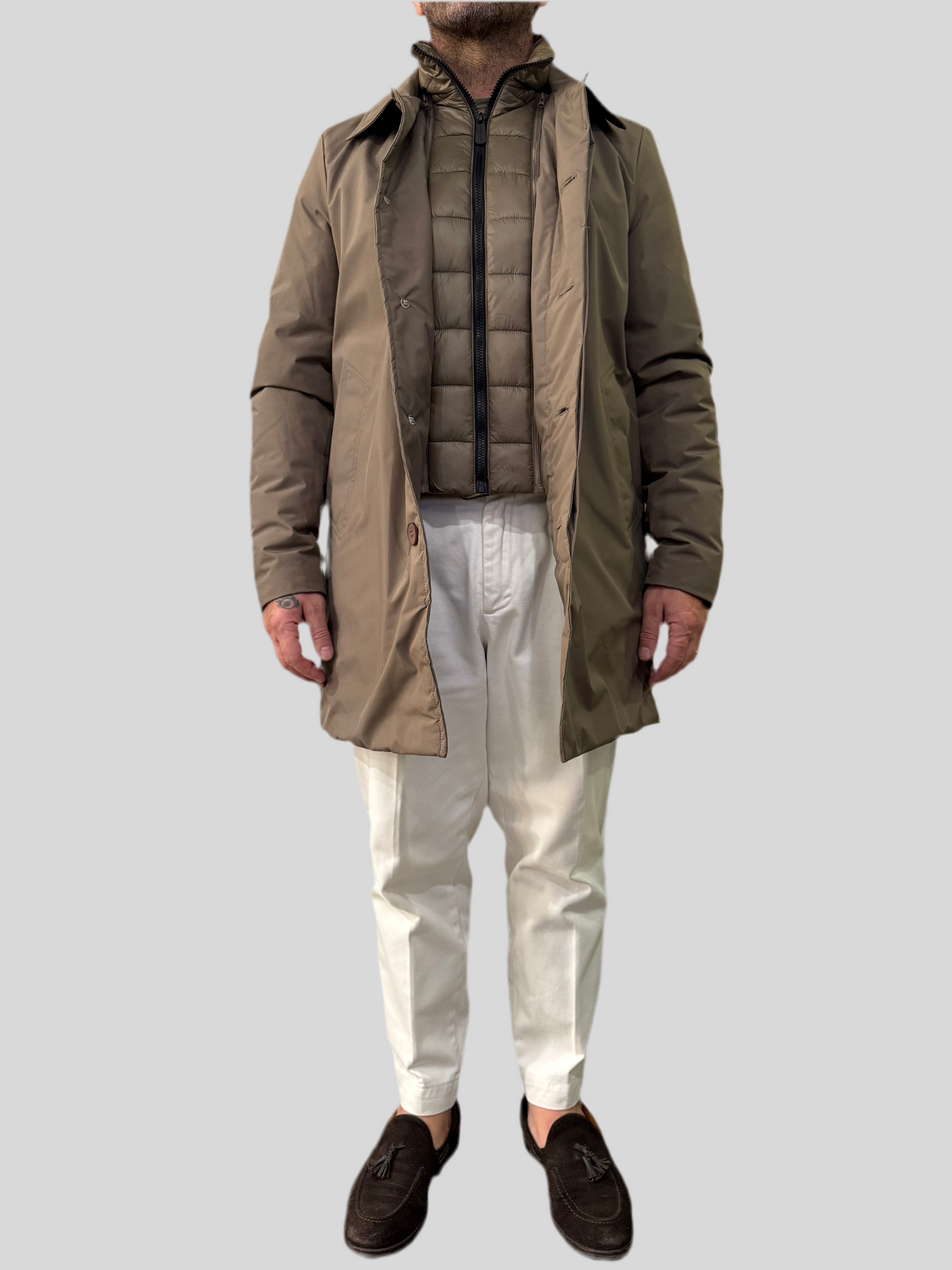Questo trench imbottito con gilet interno staccabile unisce eleganza e funzionalità per la vita urbana. Il tessuto esterno in poliestere, idrorepellente e antivento, protegge mantenendo il capo leggero e confortevole. Il davantino removibile aggiunge versatilità, consentendo di adattare il capo alle diverse esigenze. La chiusura con bottoni classici e zip VISLON garantisce praticità e durata.